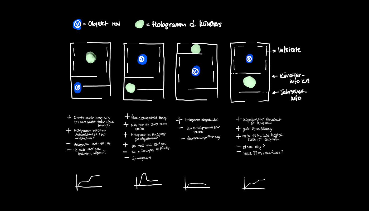 Nachdem das große Konzept stand, setzten wir uns an die einzelnen Komponenten unserer Ausstellung und deren technischer Umsetzung. Wir erstellten einen großen Variantenpool an Hologrammtechniken, damit wir für jeden Künstler die passende Inszenierung finden.