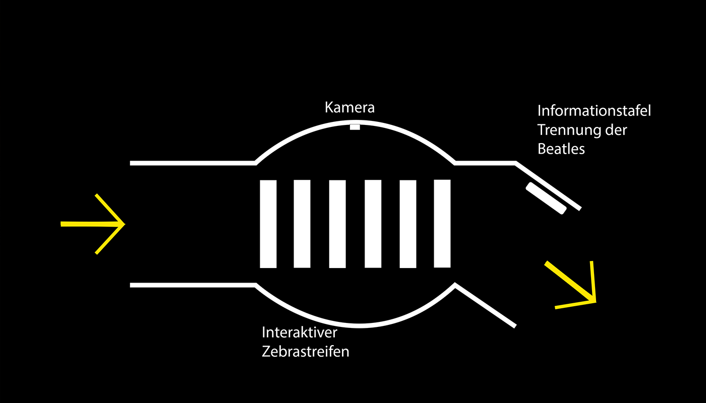 Der Besucher soll also durch Interaktion auf einem Zebrastreifen, der auf dem Boden installiert ist, die Möglichkeit erhalten, bestimmte Songs bestimmter Jahre abspielen zu können. Durch das Betreten der einzelnen, mit Jahreszahlen beschrifteten, Streifen wird der Top-Song des jeweiligen Jahres abgespielt. Außerdem soll es die Möglichkeit geben, selbst auf dem Abbey Road zu posieren und das Cover persönlich nachzustellen. Dieser Moment soll mithilfe eines Fotos festgehalten werden. Zusätzlich sollen nach dem Zebrastreifen Infotafeln zur Trennung der Beatles genauere Information enthalten. Zum Ausklang soll am Ausgang der Song „Let it be“ gespielt werden.