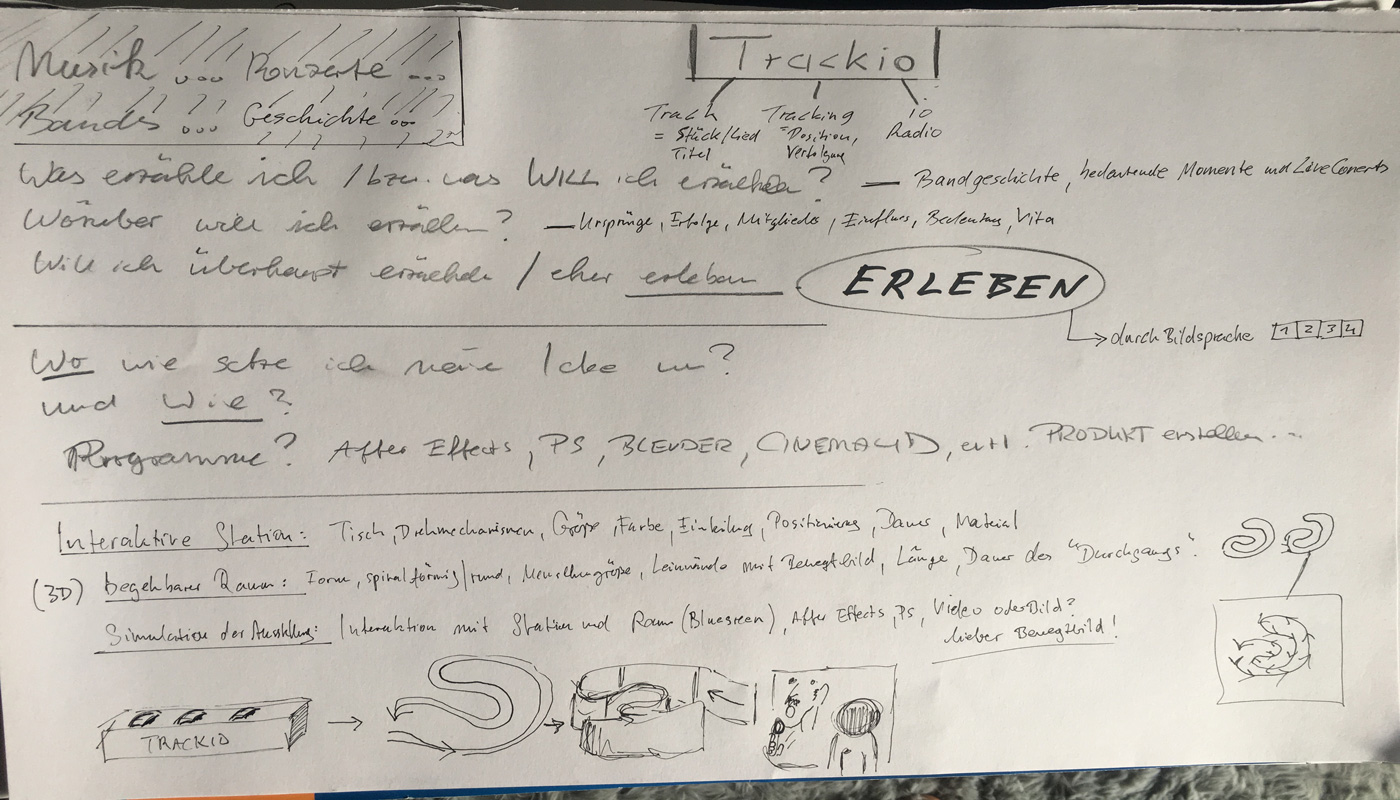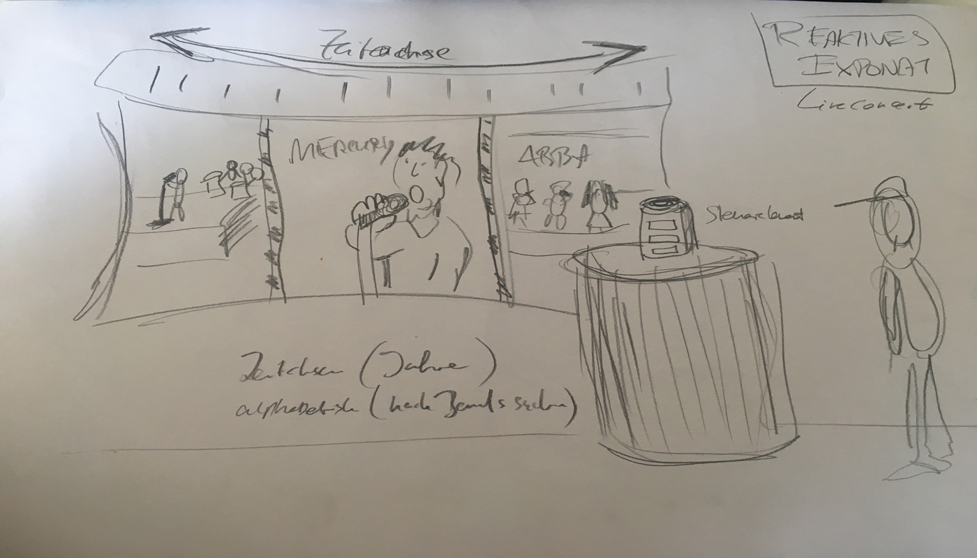 Eine interaktive-mediale Station soll konstruiert werden, indem sich der Rezipient mittels eines Steuerelements an einem großen Screen druch die Zeit bewegt um Ereignisse und ikonische Momente von Künstlern und Bands einzufangen.