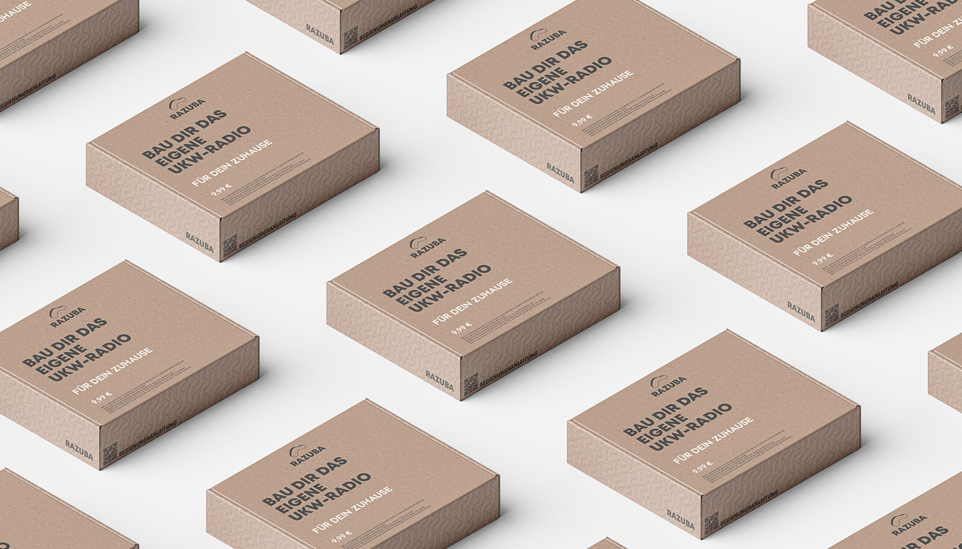 Im nächsten Schritt habe ich mich für eine Verpackung entschieden und eine detailierte Skizze angefertigt. Des Weiteren habe ich mich, zum ausprobieren der Idee, für ein Mockup entschieden. Dies zeigt noch detailreicher, wie ich mir die Verpackung vorstelle. In den Mockups habe ich das meiste noch ausprobiert und mich dann für eine endgültige Gestaltung der Verpackung entschlossen. Außerdem habe ich mir den Namen "RAZUBA" überlegt. Hinter dem Namen steckt die Bedeutung: RAdioZUmBAuen Als Logo habe ich mein bisher gestaltetes Radio in eine Vektor-Objekt umgewandelt. Des Weiteren wollte ich die Verpackung noch mehr nach meinem Radiodesign aussehen lassen. Daher habe ich ein eigenes Muster gestaltet, welches aus dem vereinfachten Radio besteht. Von unten kann man sich die Schablonen ausschneiden und sich somit sein eigens Radio bauen. Die Bedienungsanleitung würde dann an der Seite der Verpackung als QR-Code angegeben sein. Somit spart man auch wieder unnötiges Papier.