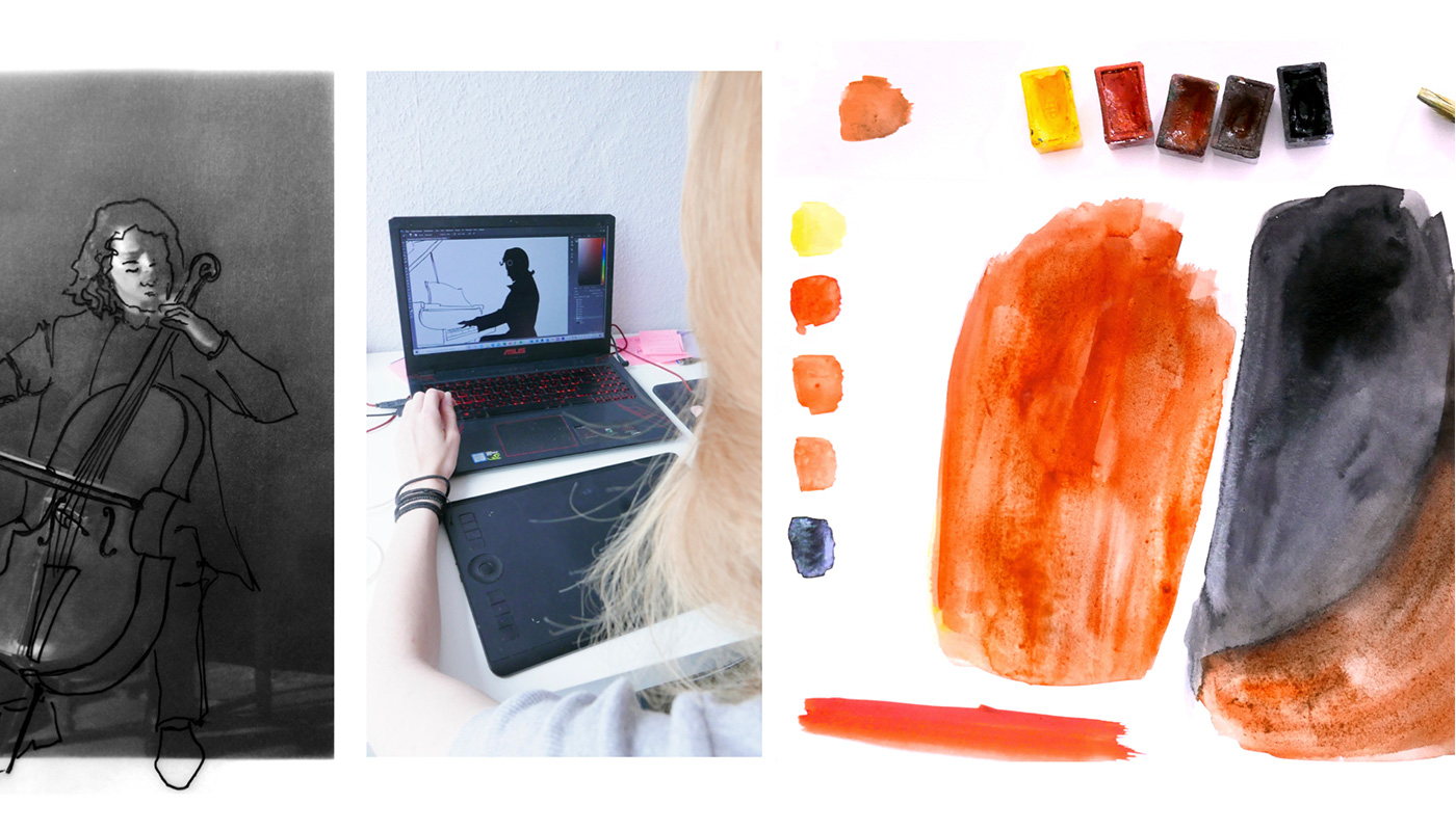 Unter Berücksichtigung der geleisteten Recherche wurden Illustrationen von weiteren Musikern in Photoshop erstellt. Alle Illustrationen wurden Schritt für Schritt durchgeführt. Die Lineart wurde auf einen transparenten Hintergrund übertragen, ebenso wie die Figuren in dunklen Grautönen und schwarzen Silhouetten.