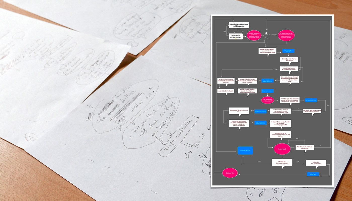 Während der mehrstündigen Diskussion wurde ein Flussdiagramm erstellt, das die Funktionsweise des Ausstellungsstücks beschreibt. Darüber hinaus haben wir ein Storyboard erstellt, das Schritt für Schritt die Interaktion des Besuchers mit der Projektion veranschaulicht.