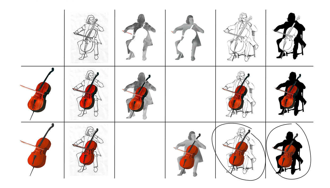 Zunächst führten wir ersten Illustrationsversuche durch. Dabei machte jede von uns Vorschläge, die mit Hilfe einer morphologischen Matrix strukturiert werden konnte.