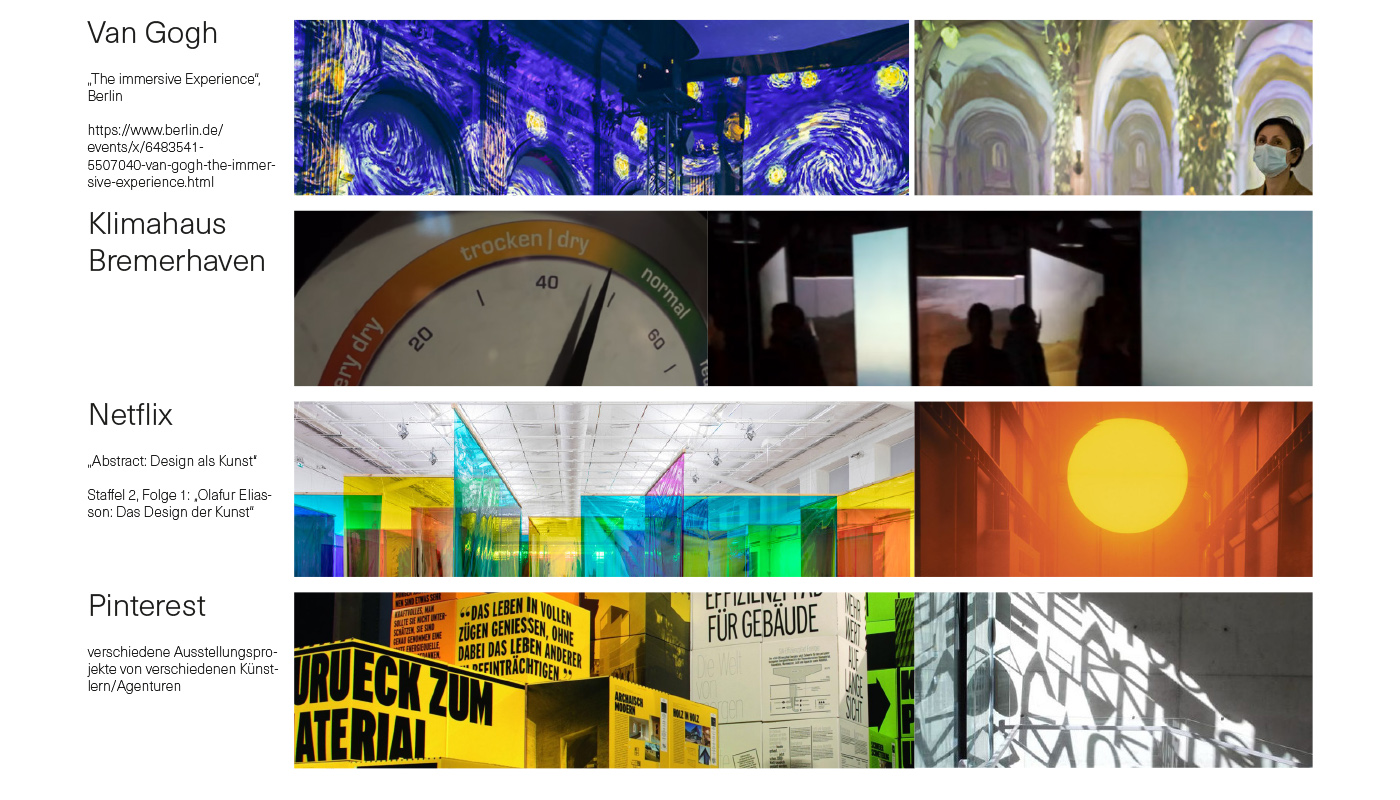Zunächst habe ich mich dem Ausstellungsraum gewidmet und Inspiration auf Platformen wie Pinterest oder Netflix gesucht, aber auch manche bereits bestehende Ausstellungen oder Museen gefunden, deren Konzept meinen Vorstellungen nahekommen. Mein Hauptaugenmerk lag hierbei darauf, dem Zuschauer eine Themenausstellung zu präsentieren und mehr ein Gefühl, bzw. einen Eindruck zu vermitteln, als Informationen zu transferieren.
