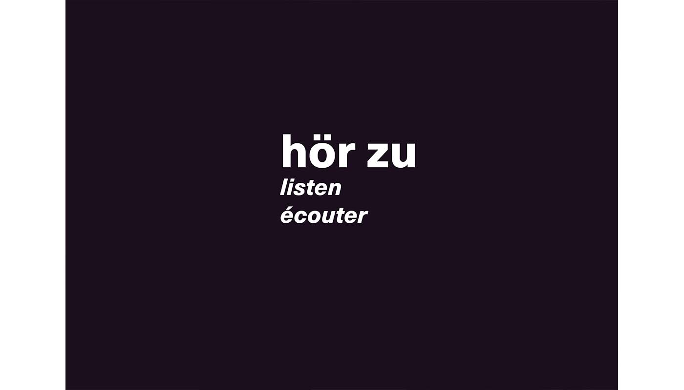 Nachrichten: Komplett unbeleuchteter Raum, nur der Schriftzug („hör zu“) leuchtet.