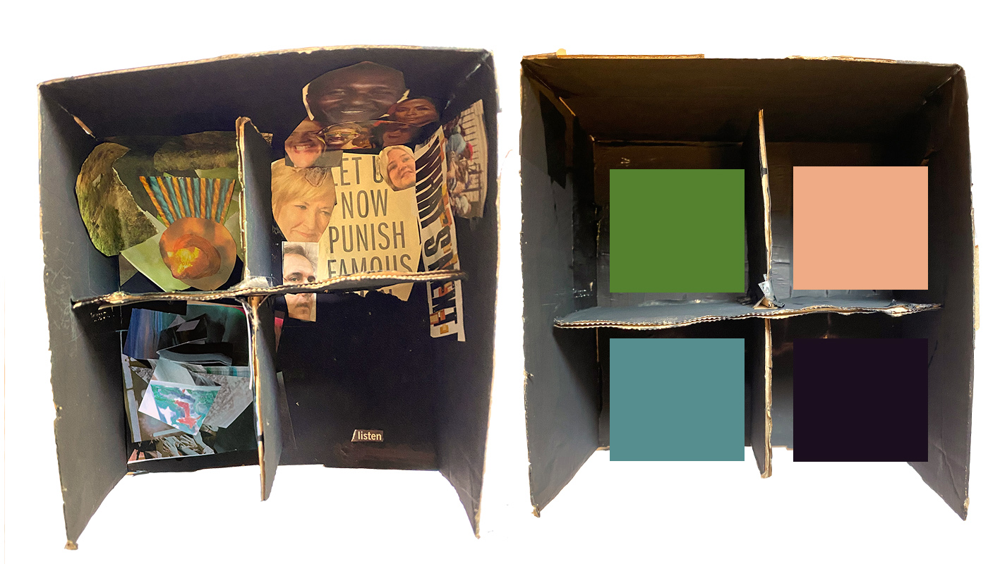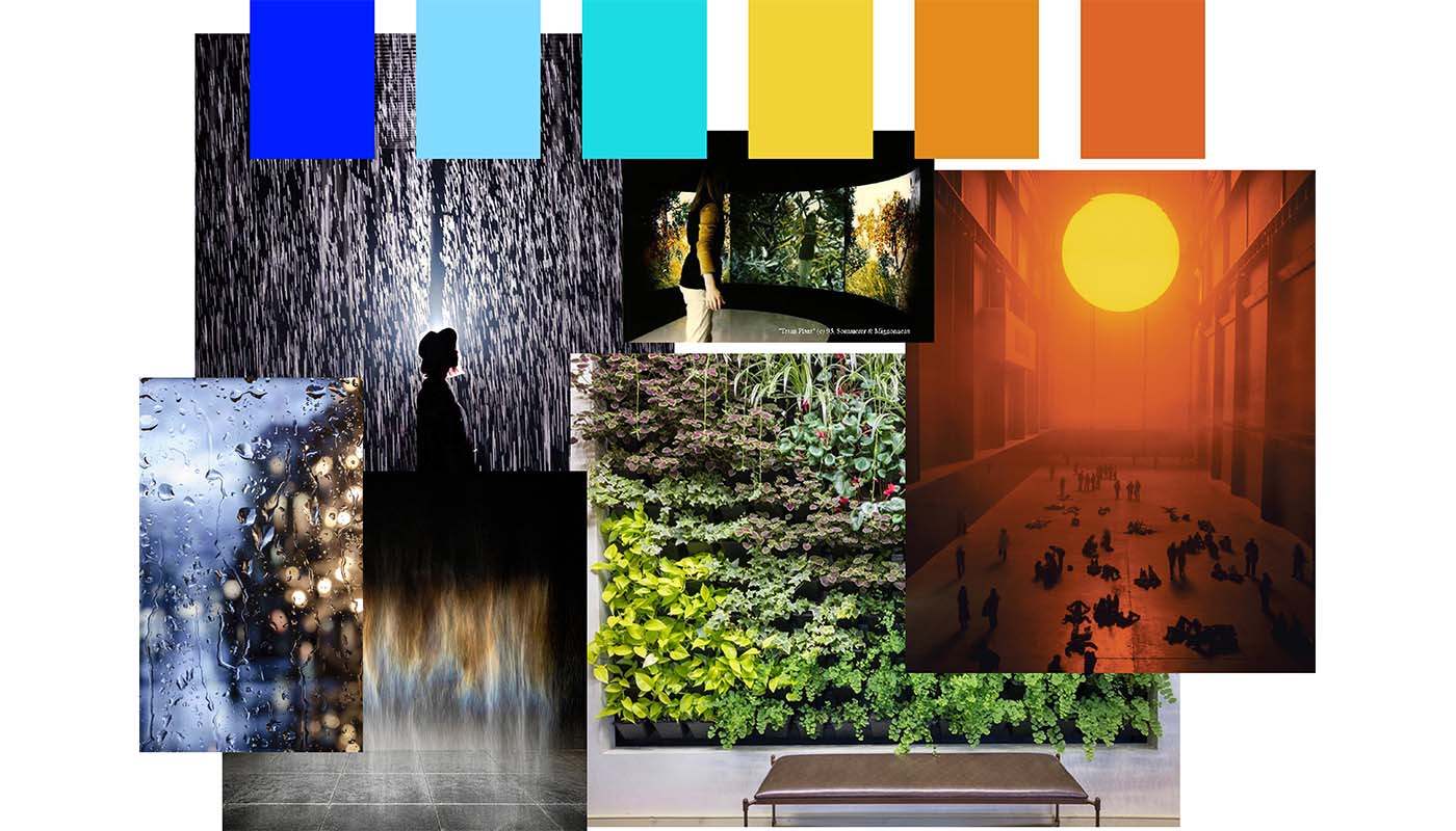 Ich habe zuerst vier sich grundlegend voneinander unterscheidende Moodboards zu den entsprechenden Räumen erstellt und diese in ein 3D-Modell übertragen. Nach Fertigstellung des Modells habe ich dieses genutzt, um die Farbpalette für die Plakate abzulesen.