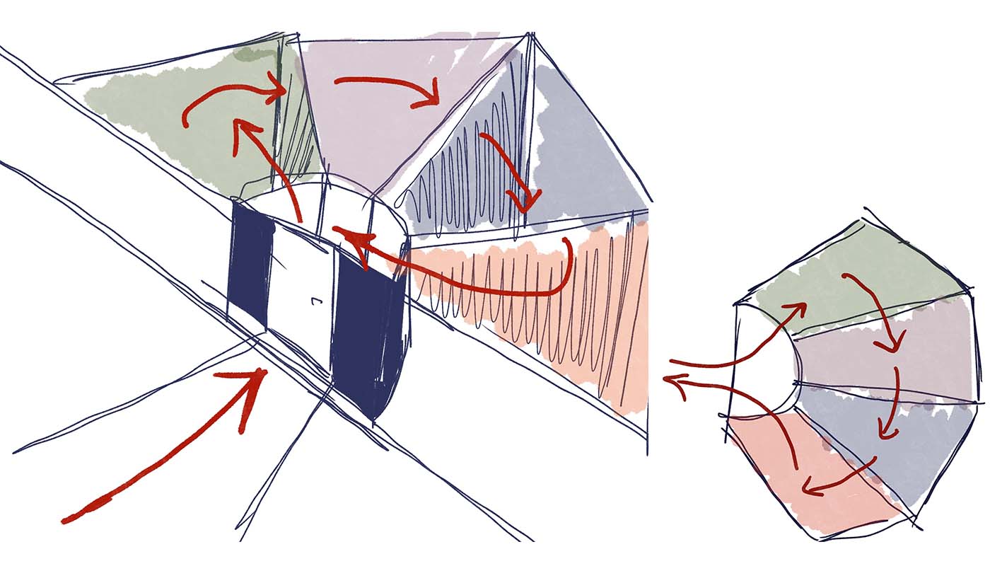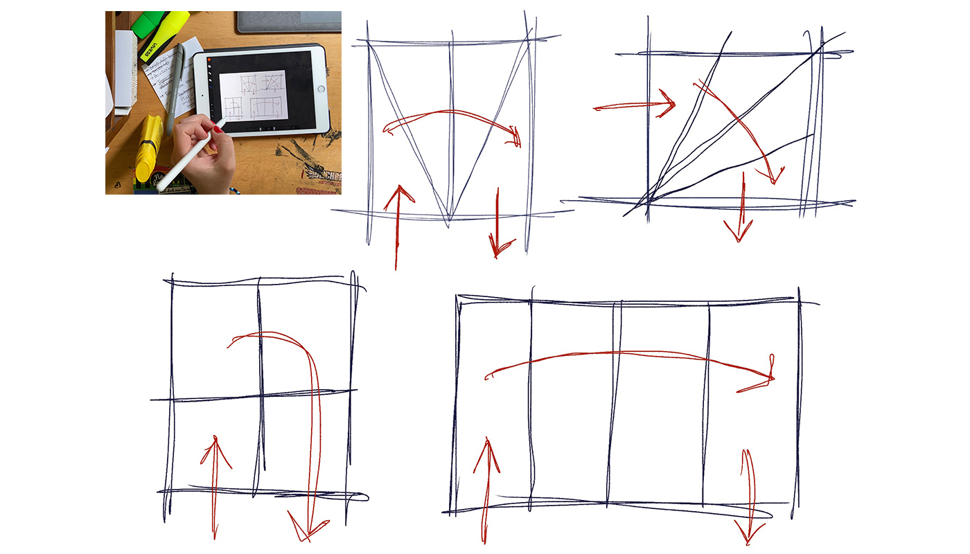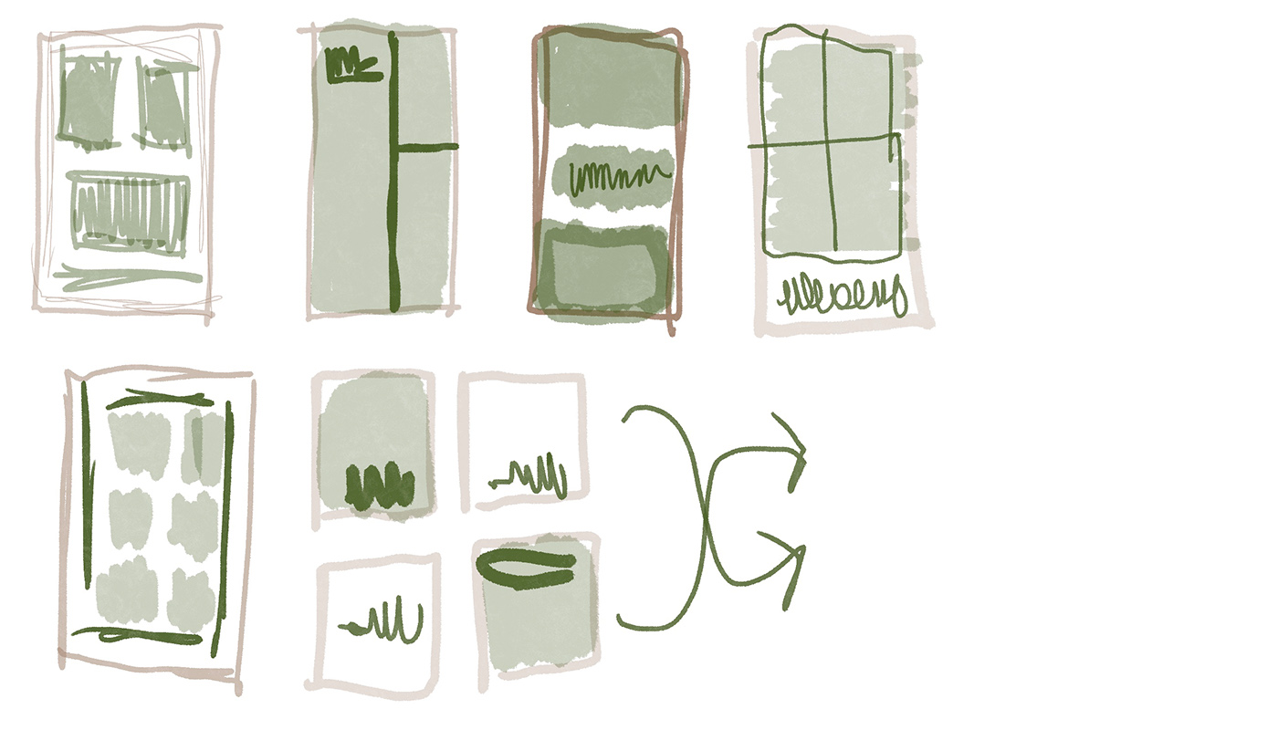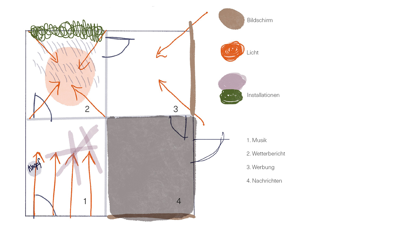 Verschiedene Ideenscribbles zum Aufbau des Raumes