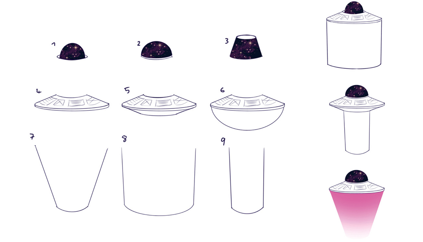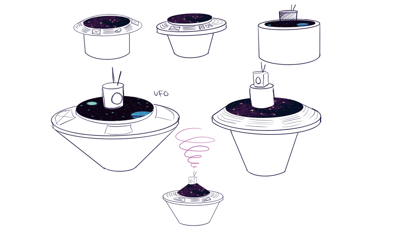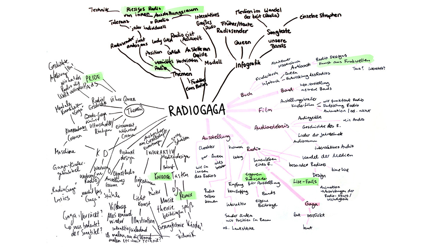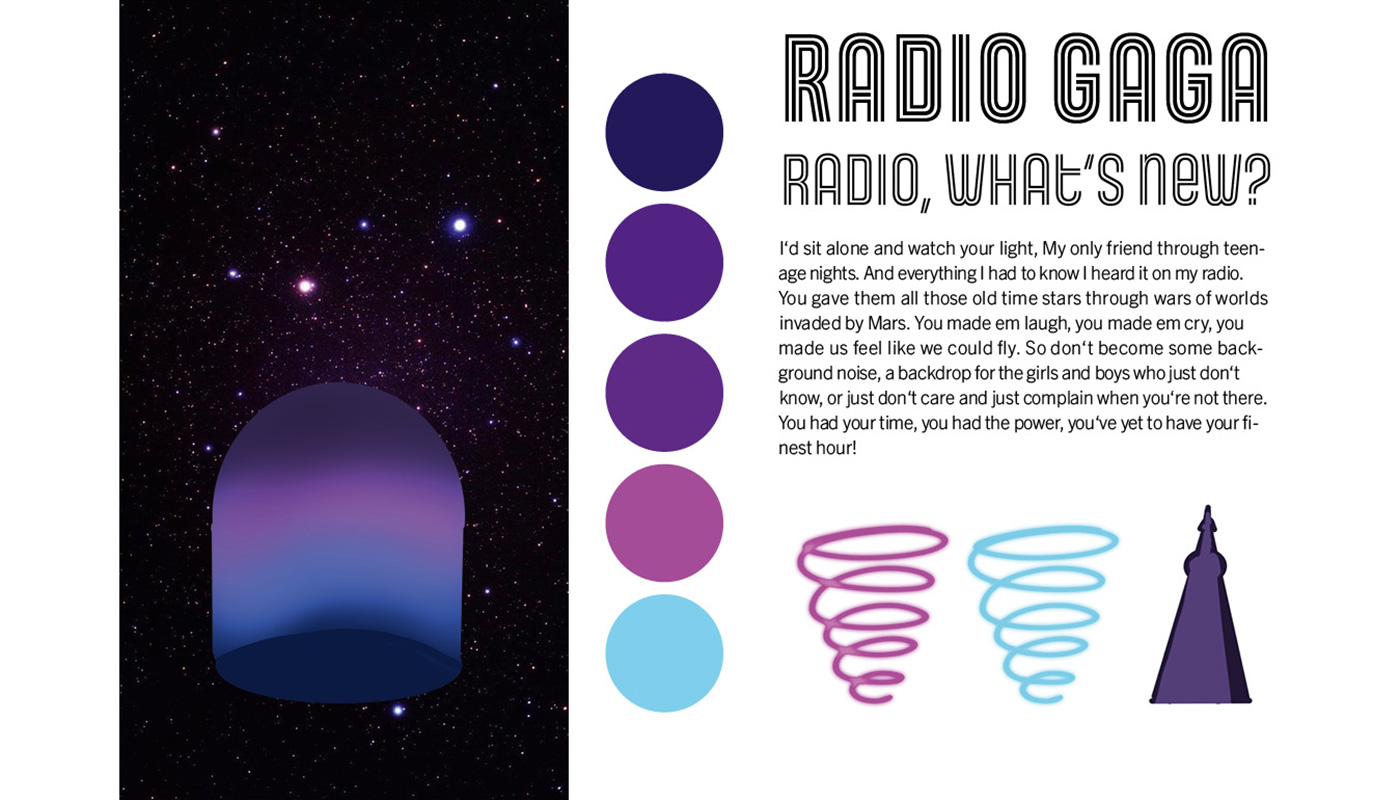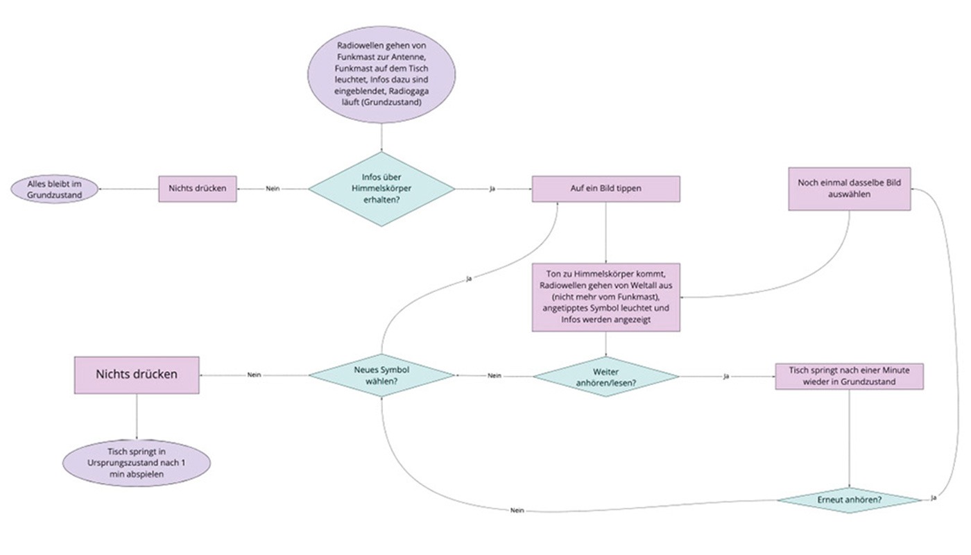 Zuerst beschäftigten wir uns mit der Gestaltung des Raumes und den darin befindlichen Elementen. Wir erstellten verschiedene Skizzen zu dem Aussehen der Wände, der Raumform, der Platzierung der Wellen des Tisches, des Funkmasts und der Tür und entschieden uns für einen runden Raum mit Kuppel, der einem Planetarium ähnelt. Die Radiowellen kommen in der Mitte des Raumes von oben. Sie könnten zum Beispiel mithilfe von Projektoren und einer beinahe durchsichtigen, trichterförmig über dem Tisch aufgehängten Gaze in den Raum projiziert werden. Wir setzten uns genauer mit der Visualisierung dieser Wellen auseinander. Dabei probierten wir von wissenschaftlichen Visualisierungen bis hin zu eigenen Kreationen alles aus und entschieden uns letztendlich für eine Spiralform, wobei die irdischen Wellen, die vom Funkmast ausgehen, pink und die außerirdischen grün-türkis sind. Nach einigen Skizzen und Überlegungen entschieden wir uns dazu, die Informationen über den Tisch in der Mitte visuell zu vermitteln. Der nächste Schritt war das Styleboard: Wir legten das Farbschema des Raumes fest, ebenso wie die Schriftart (Gala: futuristisch und passend zu den Radiowellen). Um uns die Funktionsweise des Raumes genauer vor Augen zu führen, erstellten wir ein Flowchart Diagramm: Wir gestalteten die verschiedenen Möglichkeiten, die der Betrachter hat und die Reaktion der Radiowellen, der Tonspur und der Informationen auf dem Tisch. Die Tonspur besteht aus von der NASA veröffentlichten Audio-Aufnahmen, in der sie Radiowellen, die aus dem All empfangen wurden, in Ton umwandelte. In unserem Raumkonzept hört man, wenn ein Element auf dem Tisch ausgewählt wird, die passende Tonspur, die für jeden Himmelskörper anders klingt.