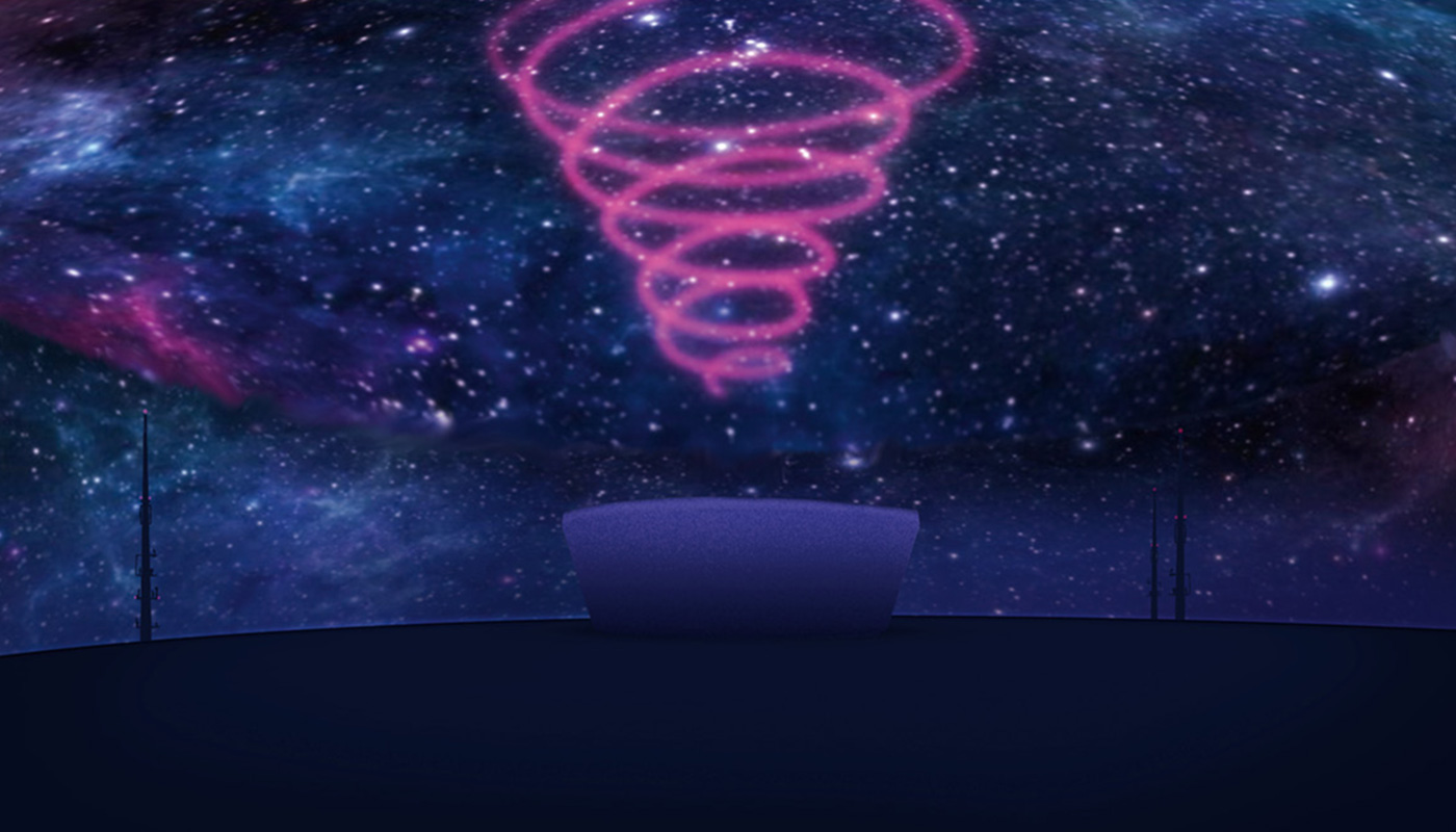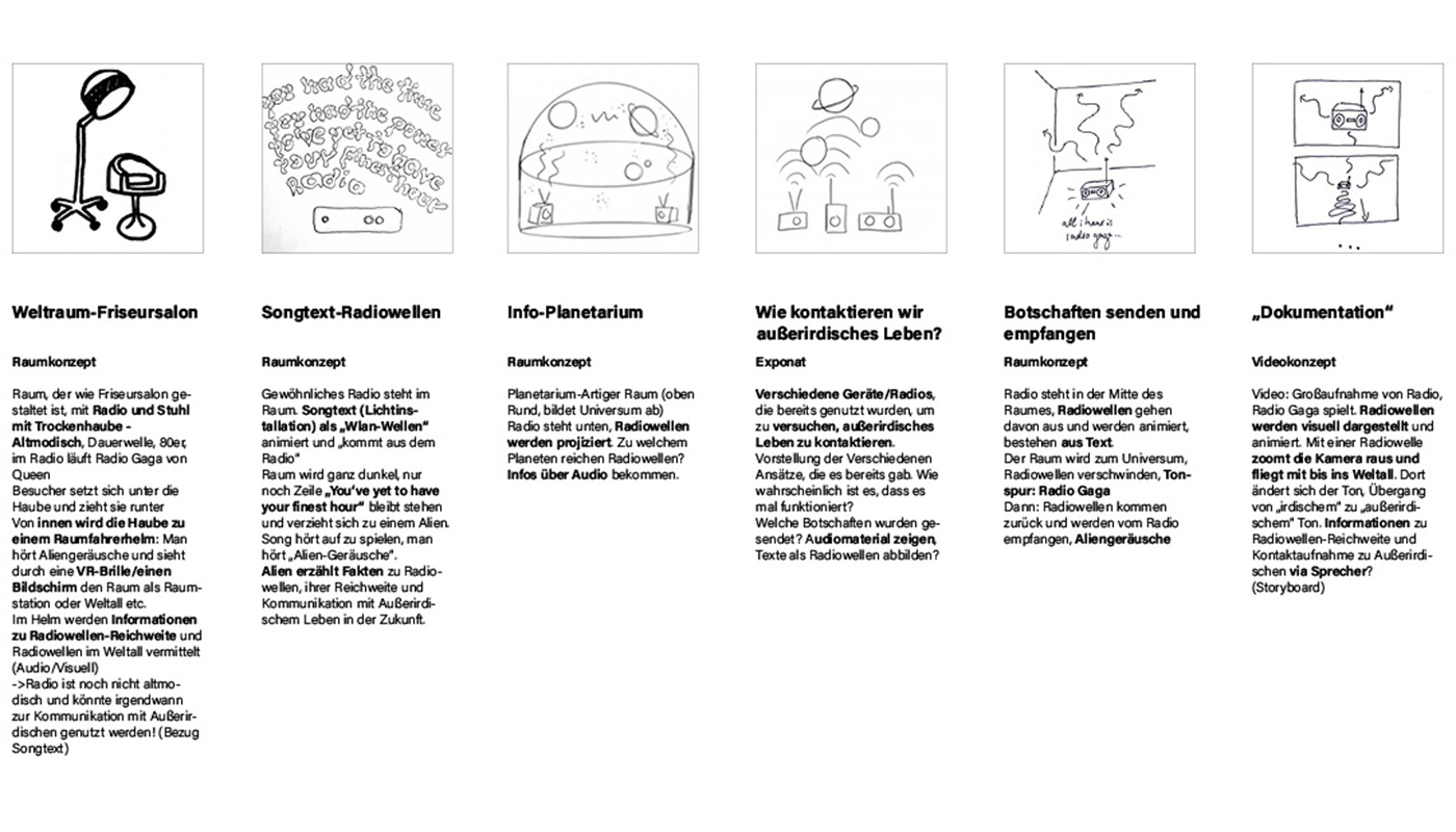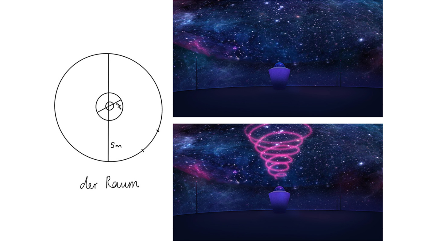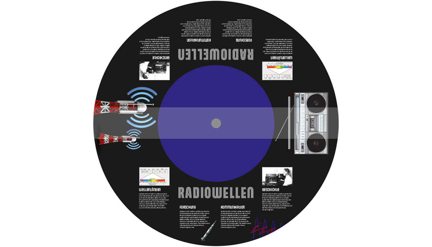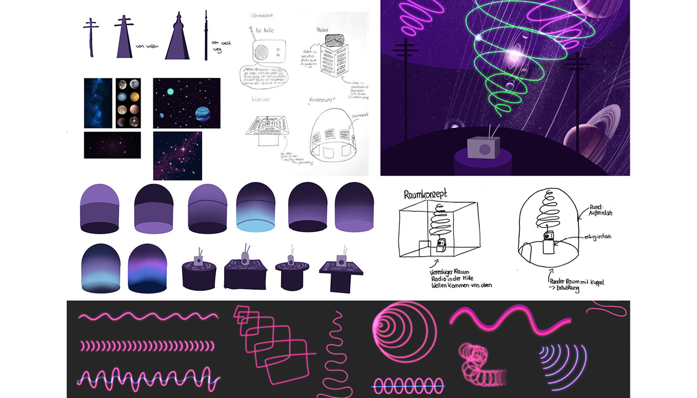 Wir möchten zeigen, dass Radiowellen nicht nur auf der Erde hin und her gesendet werden können, sondern auch, dass es möglich ist, Radiowellen aus dem All zu empfangen, wodurch neue Kenntnisse in der Erforschung des Weltraums gewonnen werden können. Diese Radiowellen machen wir in unserem Raumkonzept erfahrbar. Dabei steht in einem runden Raum, an dessen Wänden das Weltall abgebildet ist, ein interaktiver Tisch. Mit einer Antenne in der Mitte des Tisches werden von oben aus dem All Radiowellen empfangen, welche visualisiert und hörbar gemacht werden. Auf dem Tisch in Raummitte sind via Touch verschiedene Elemente wie Planeten, Sterne und Galaxien auswählbar, alles Materie, von der elektromagnetische Wellen ausgehen. Dazu werden Infos auf dem Tisch eingeblendet und die Radiowellen im Raum sowie die Tonspur verändern sich. An der Wand befindet sich ein Funkmast, von dem irdische Radiowellen ausgehen, die sich in der Farbe von denen aus dem All unterscheiden.