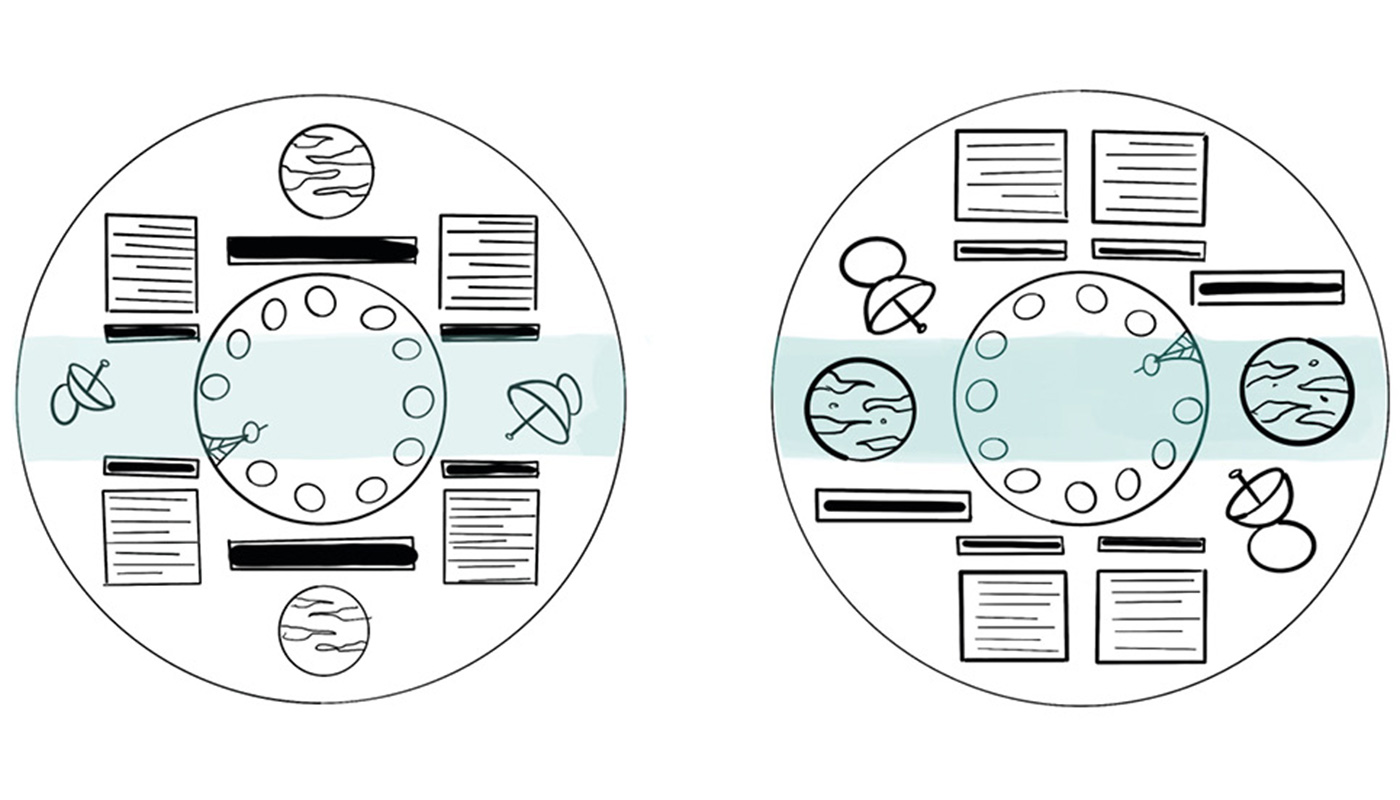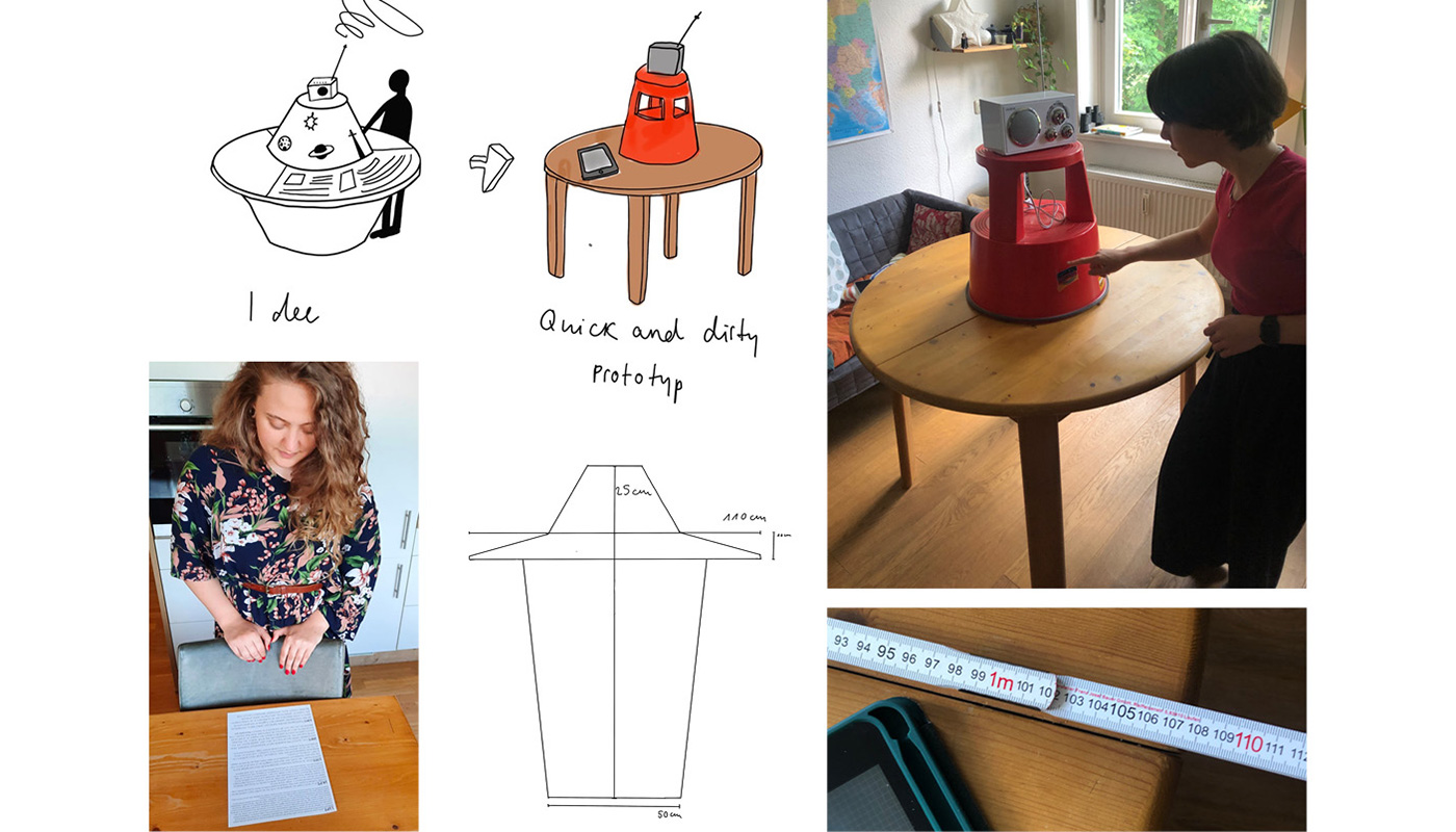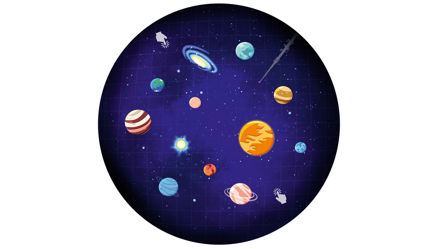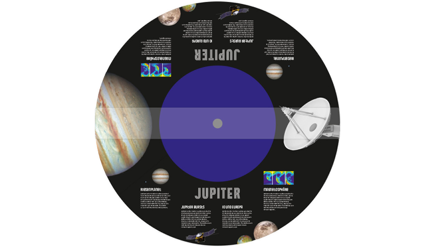 Auf den runden Tisch, der in der Mitte des Raumes steht, wird von oben mithilfe von zwei Projektoren projiziert. Für das Design arbeiteten wir mit verschiedenen Skizzen, einer morphologischen Matrix und Quick-and-Dirty-Prototypes. Anhand eines Küchentisches erarbeiteten wir Höhe und Umfang des Exponats. Anschließend legten wir die Form fest: In der Mitte eine interaktive Kuppel mit der Antenne. Besucherinnen können via Touch einzelne Elemente auswählen, die zugehörigen Informationen werden außenherum auf eine leicht angeschrägte Tischplatte projiziert. Für die Schrift testeten wir die Lesbarkeit mithilfe von Ausdrucken und entschieden uns für die Schriftgröße 17 pt im Fließtext. Anschließend setzten wir das Layout für die Informationen zu Jupiter um, das als Template für alle Himmelskörper dient. Übersichtliche Textblöcke erlauben es den Besucherinnen, in kurzer Zeit relevante Informationen zu erfassen. Mithilfe von zwei Animationen visualisierten wir den möglichen Ablauf der Installation mit Tonspur und Radiowellen.