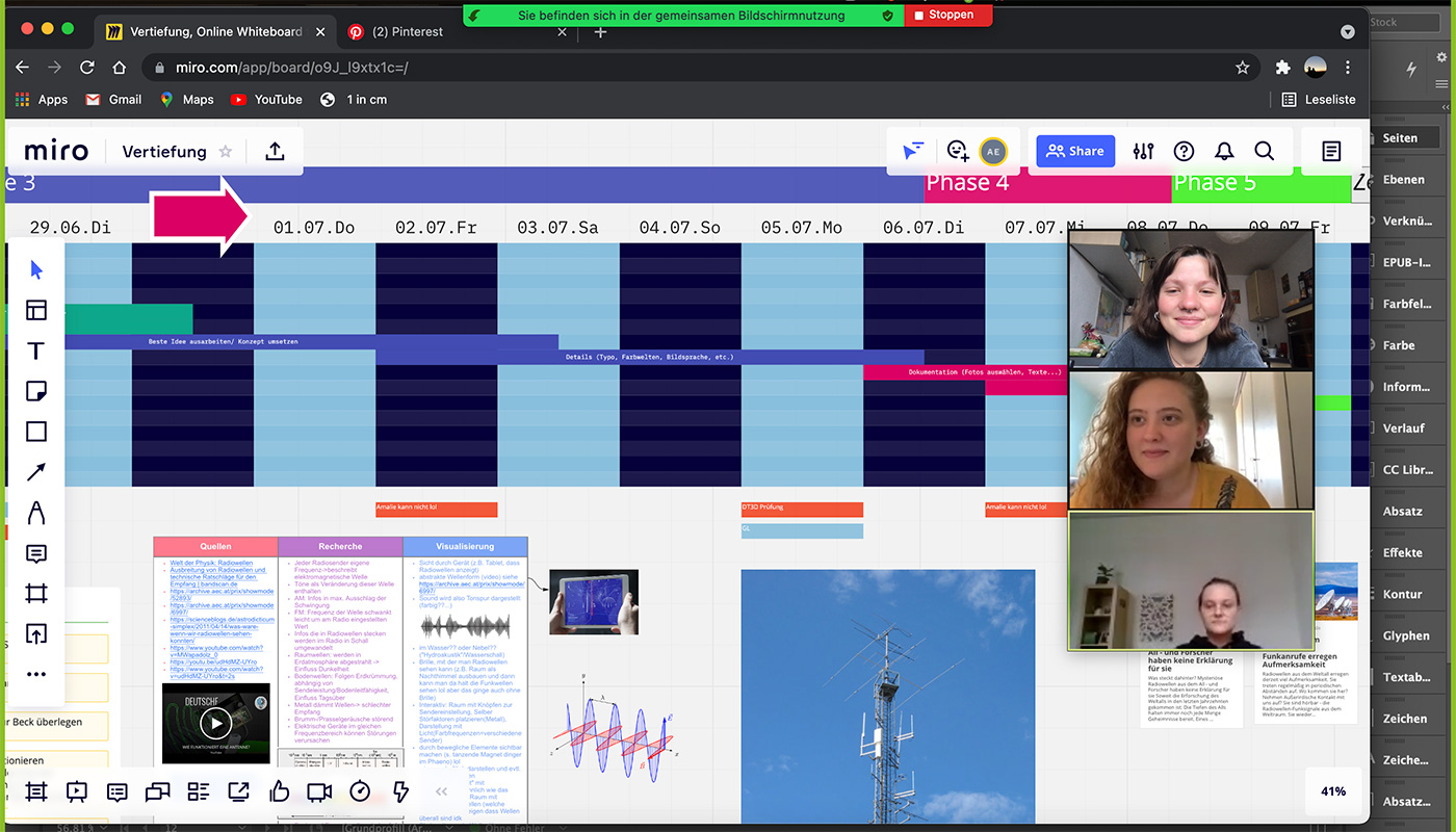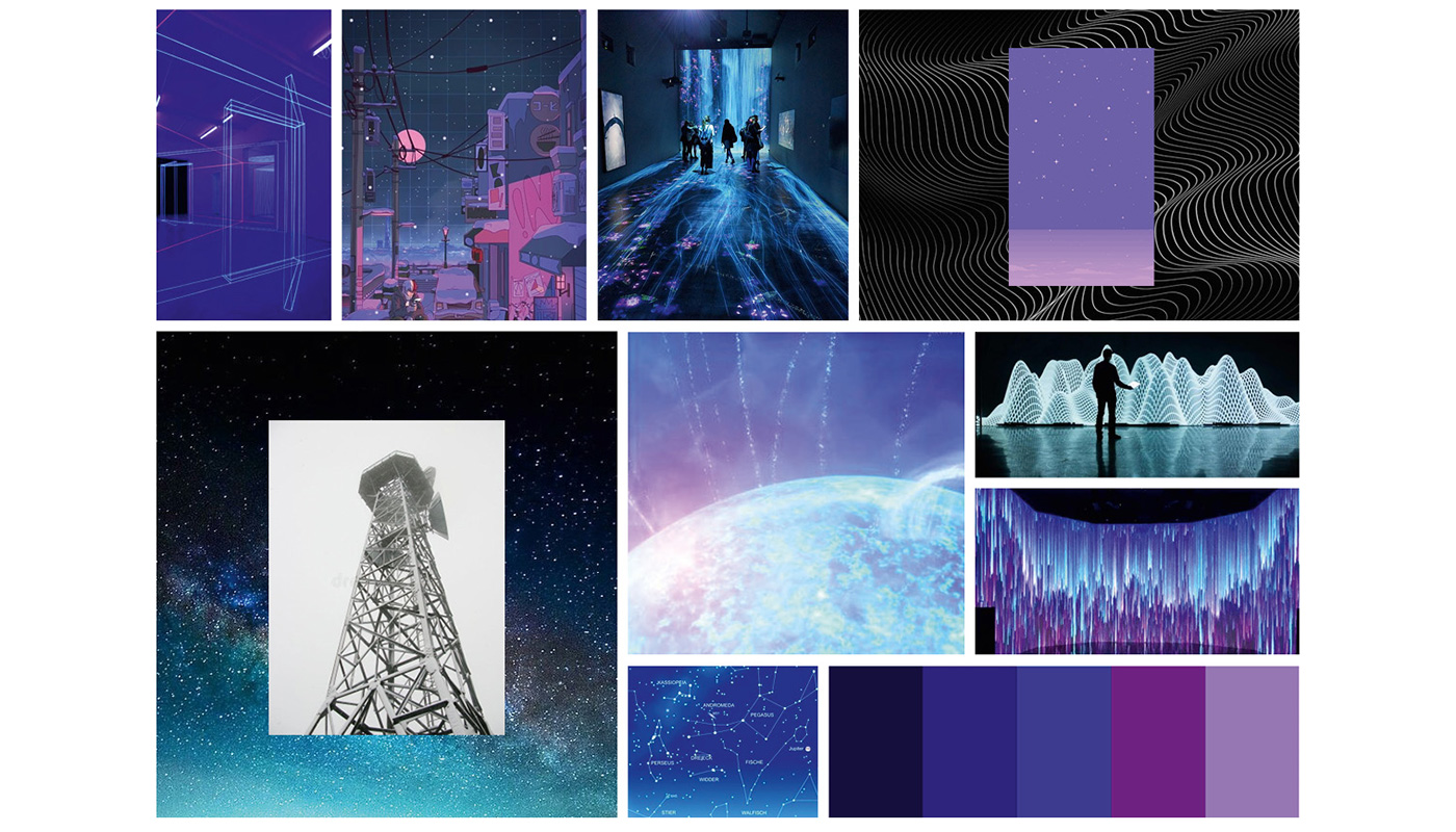 Nachdem wir uns grob für die „Visualisierung von Radiowellen“ als unser Thema entschieden hatten, fehlte uns noch ein konkreter Ansatz für die Inhalte, die wir vermitteln wollten. Darum begann unser Projekt mit einer eingehenden Recherche über Radiowellen: Wellenlängen, die Funktionsweise einer Antenne, Magnetfelder und weitere physikalische Themen. Schnell stießen wir auf das Thema Weltall, Galaxien und rätselhafte Radiosignale aus dem All mit unbekanntem Ursprung. Wir beschlossen, das Thema Raumforschung und außerirdische Radiosignale aufzunehmen und fanden spannende Informationen über Planeten, Sterne und Galaxien, die alle verschiedenste, natürliche elektromagnetische Wellen aussenden und uns so auf der Erde mehr über die Materie im All erfahren lassen. Wir kamen über einige Umwege auf die Idee, einen Raum ähnlich einem Planetarium zu konzipieren, der den Besucher*innen entweder via Audio oder visuell Informationen vermittelt, und gleichzeitig eine Atmosphäre herstellt, in die man ganz eintauchen kann.