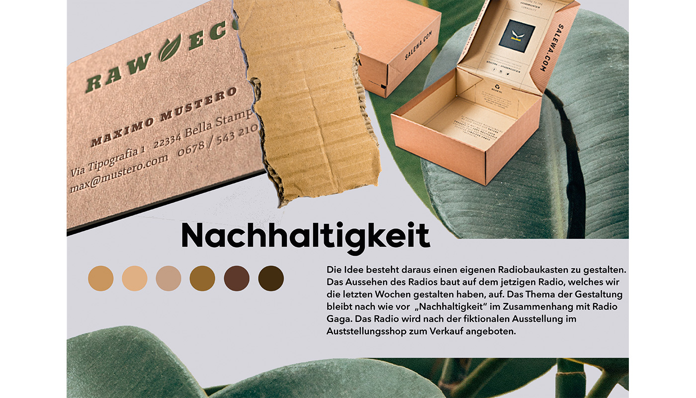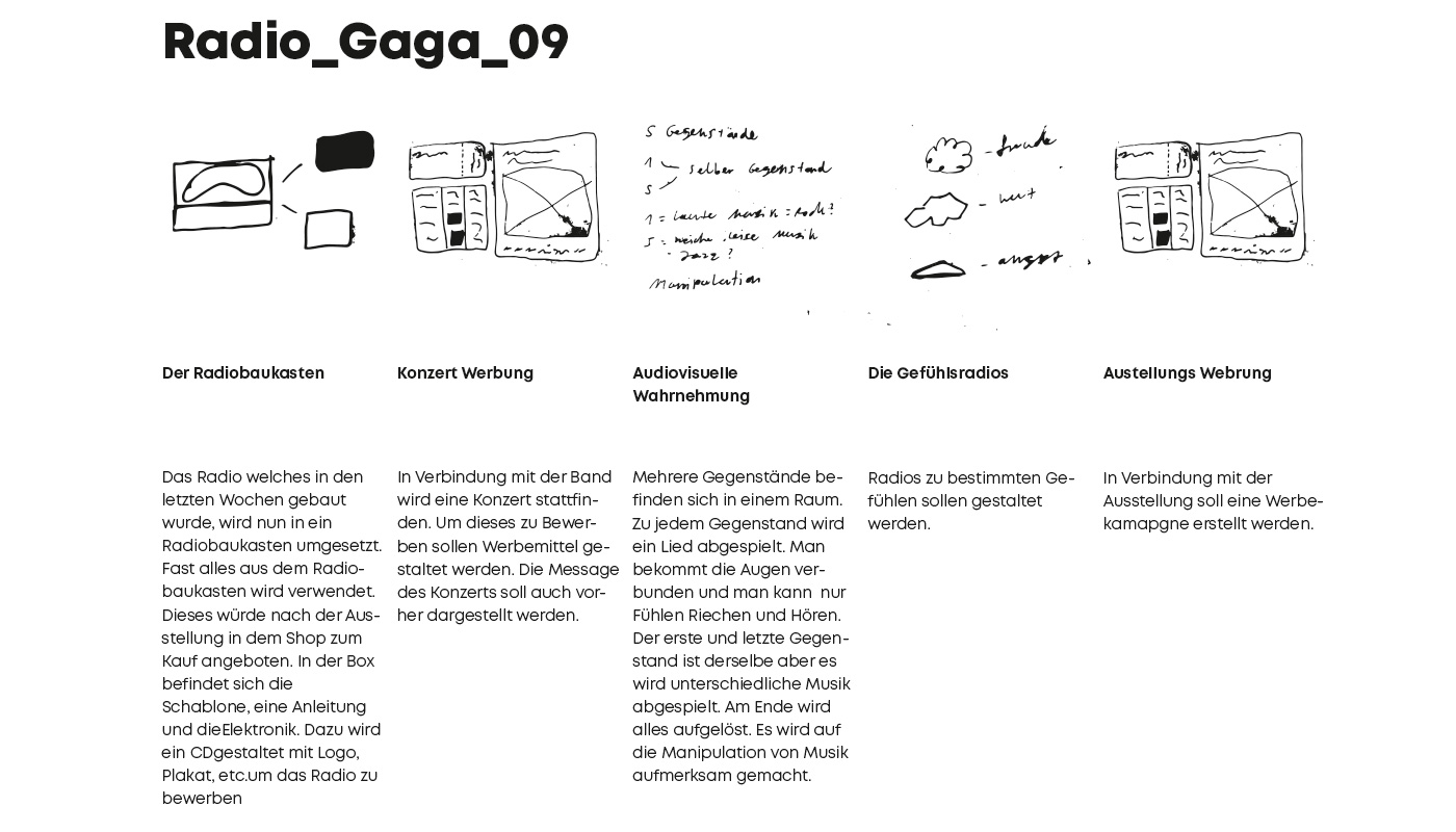 Die Idee besteht daraus einen eigenen Radiobaukasten zu gestalten. Das Aussehen des Radios baut auf dem jetzigen Radio, welches wir die letzten Wochen gestalten haben, auf. Das Thema der Gestaltung bleibt nach wie vor „Nachhaltigkeit“ im Zusammenhang mit Radio Gaga. Das Radio wird nach der fiktionalen Ausstellung im Auststellungsshop zum Verkauf angeboten.